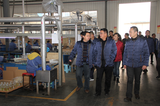 五粮液集团党委书记、董事长唐桥视察五粮液财务公司支持发展的环球集团生产车间。