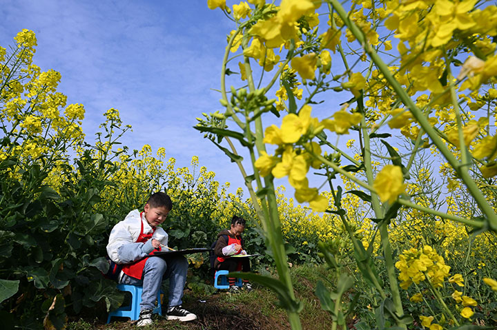 2023年2月26日,四川省内江市东兴区双才镇玉皇观村,党员志愿者指导小学生们在油菜花田间画画。
